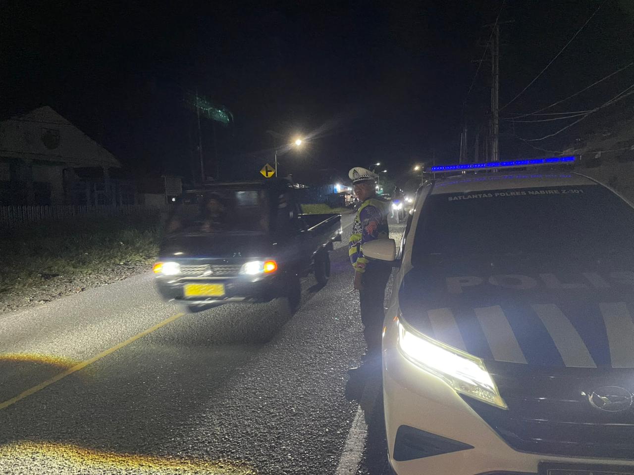 2. ​Rasa Aman dan Nyaman: Kehadiran mobil patroli dengan lampu biru yang menyala memberikan efek deteran dan memastikan keamanan pengguna jalan raya di Kabupaten Nabire pada malam hari.