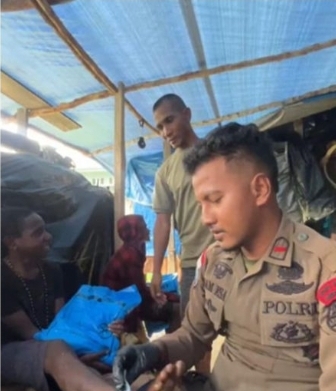 Dalam kegiatan kemanusiaan tersebut, personel Ops Damai Cartenz 2025 dengan sigap dan penuh kepedulian merawat luka anak yang tampak cukup serius.